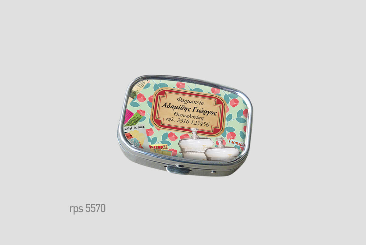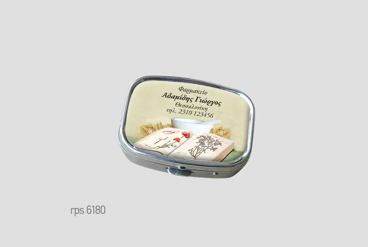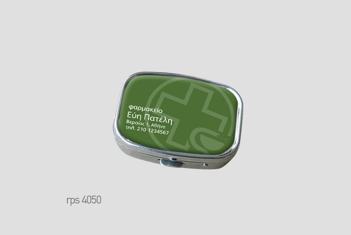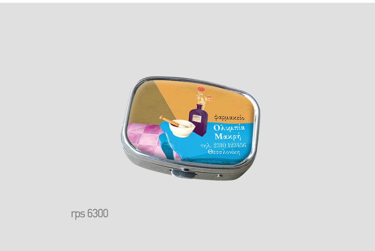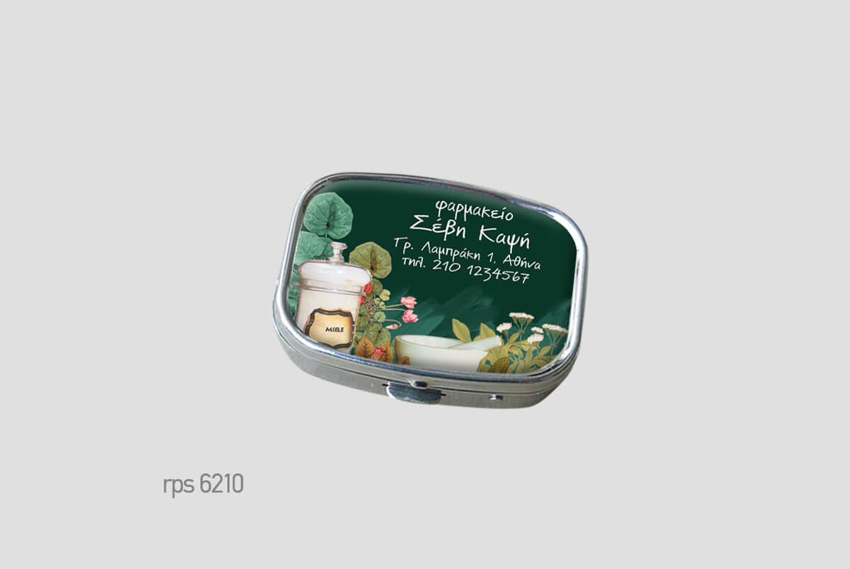 Μεταλλικό κουτάκιμε πλαστική θήκη χαπιών.Μικρό και διακριτικό,Square (ορθογώνιο) δύο θέσεωνΨηφιακή εκτύπωση και επισμάλτωση.