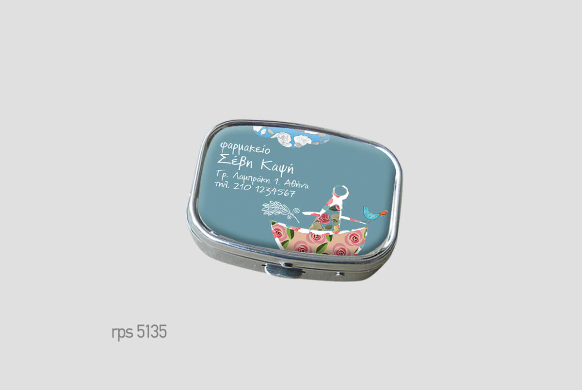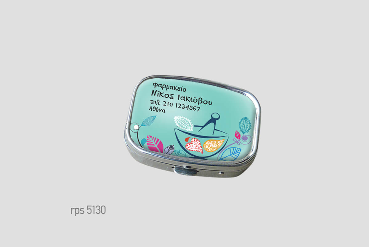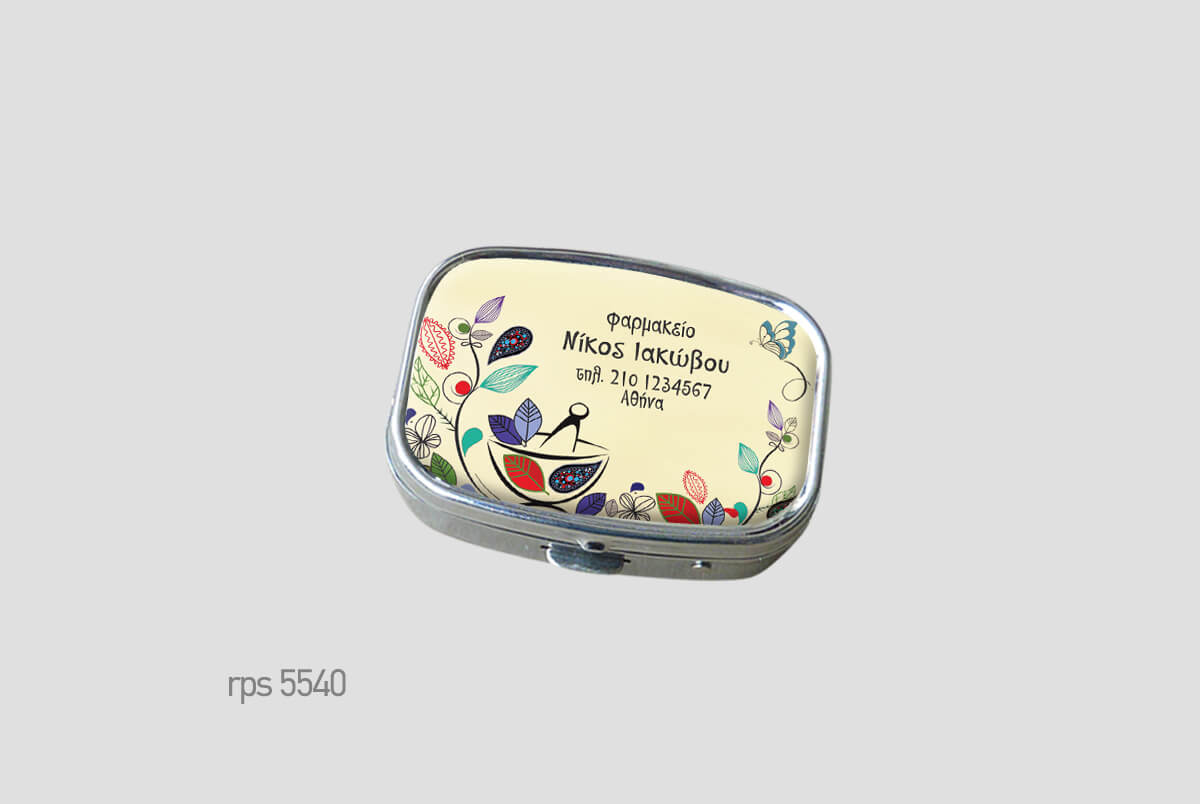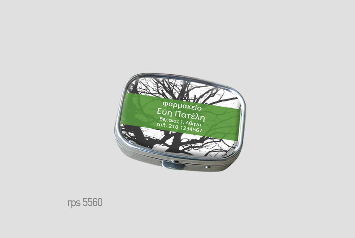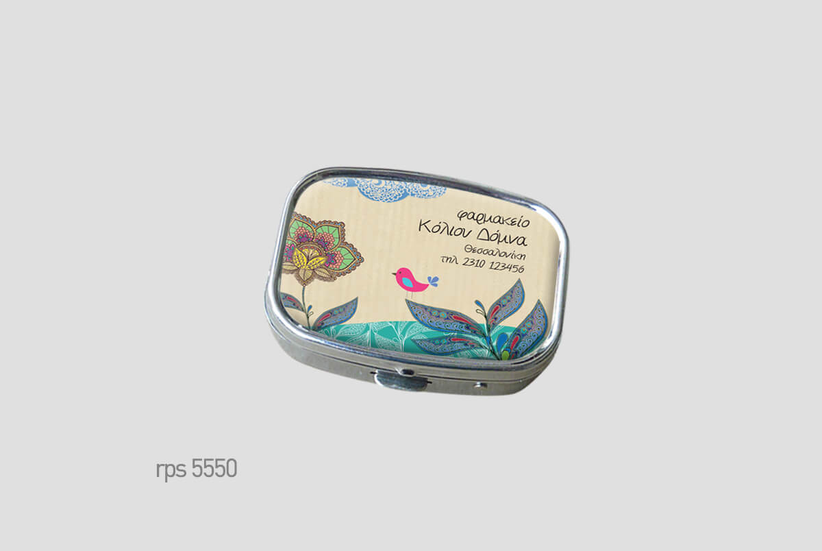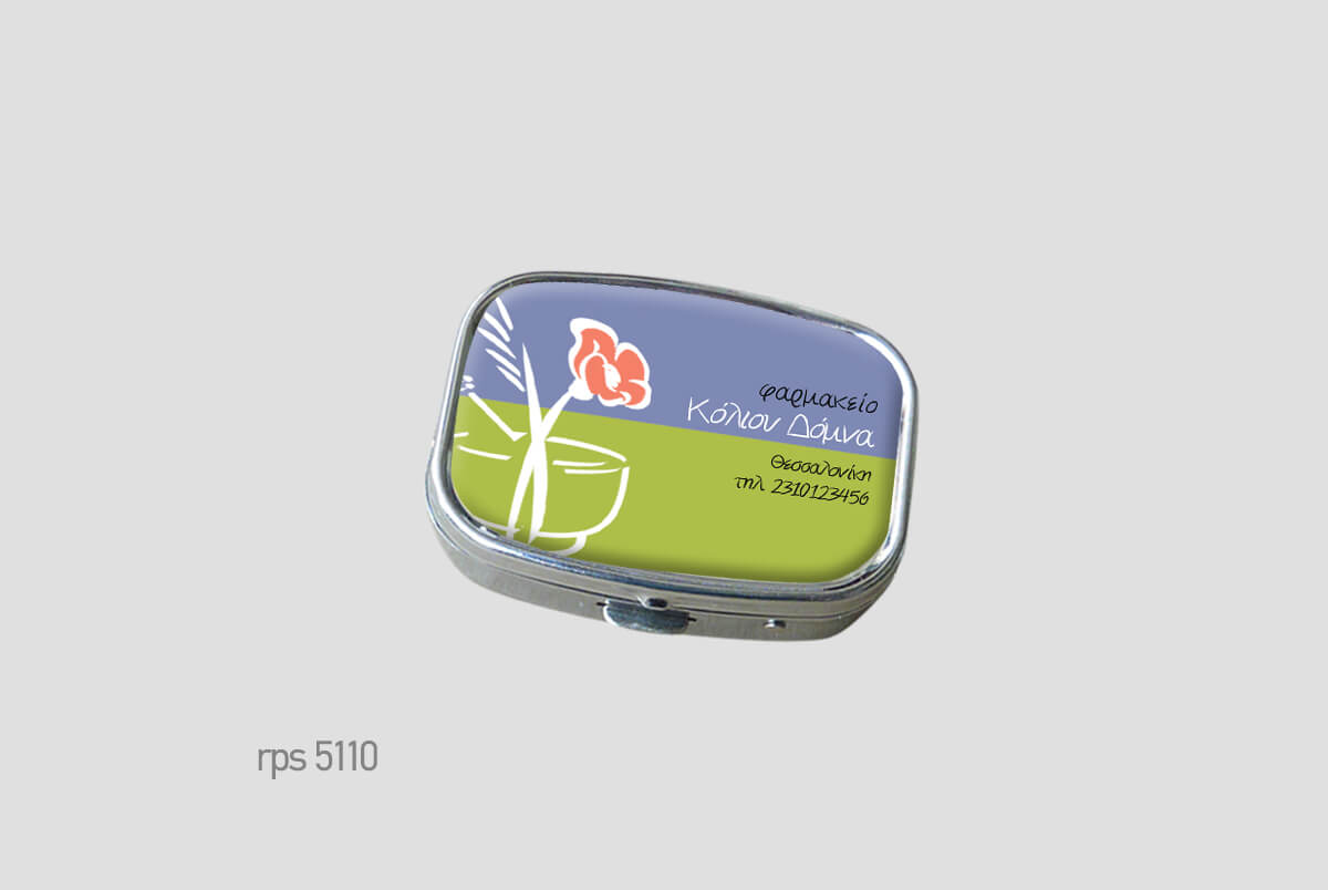 Μεταλλικό κουτάκιμε πλαστική θήκη χαπιών.Μικρό και διακριτικό,Square (ορθογώνιο) δύο θέσεωνΨηφιακή εκτύπωση και επισμάλτωση.